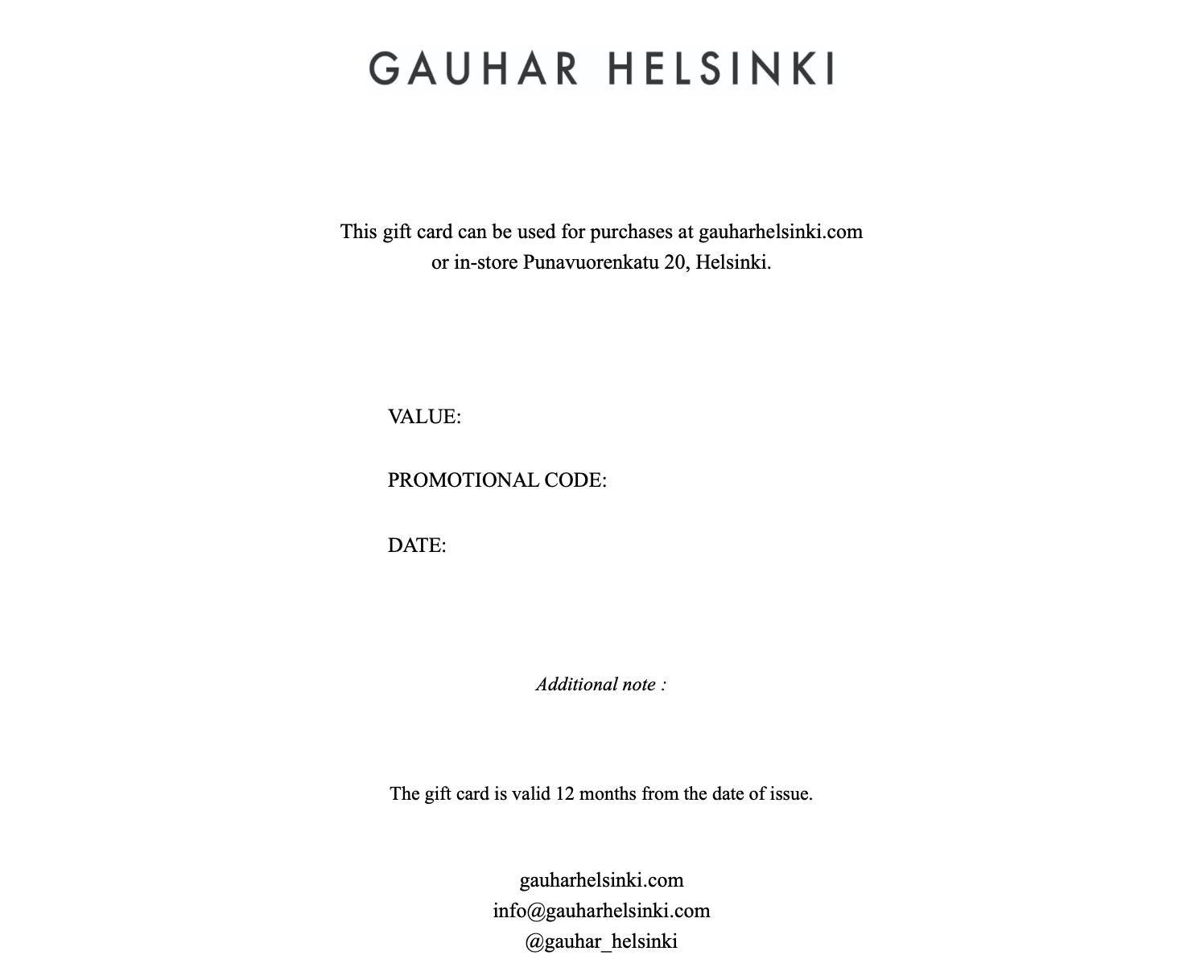 Surprise your loved one or treat yourself with a Gauhar Helsinki gift certificate. It's a  simple and quick way to brighten the day. You'll receive the gift card easily per email.